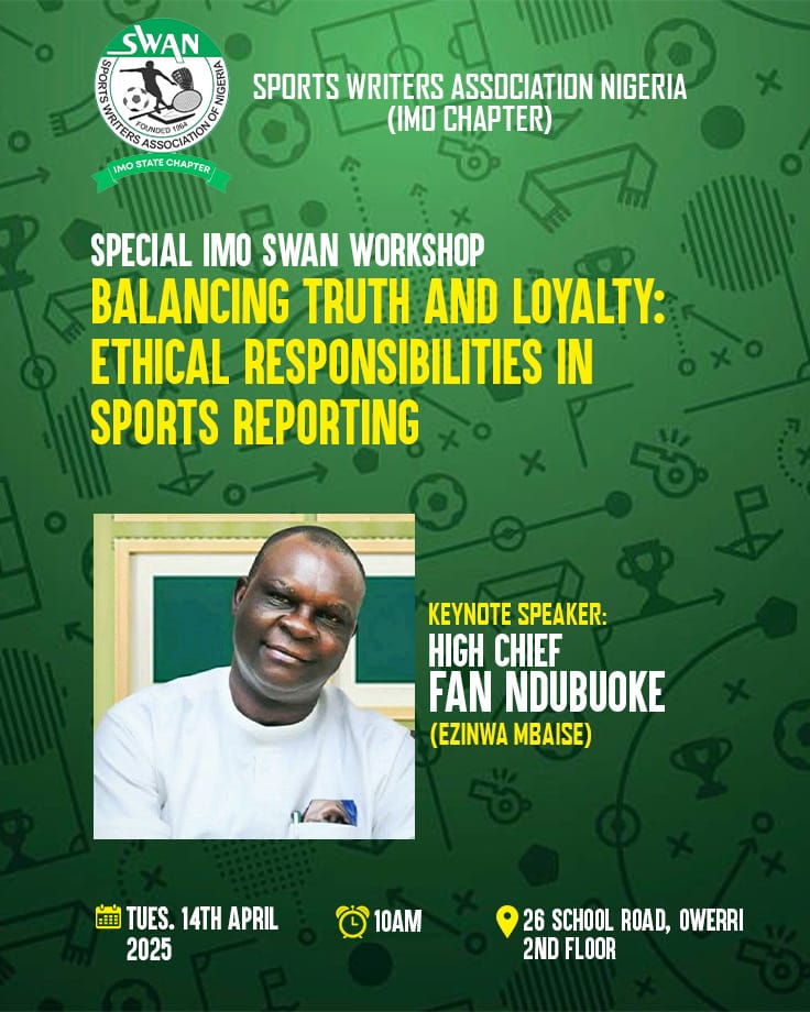 The Sports Writers Association of Nigeria (SWAN), Imo State Chapter, hereby announces a special workshop for its members, scheduled to hold alongside its general congress on Tuesday April 14th, 2026.